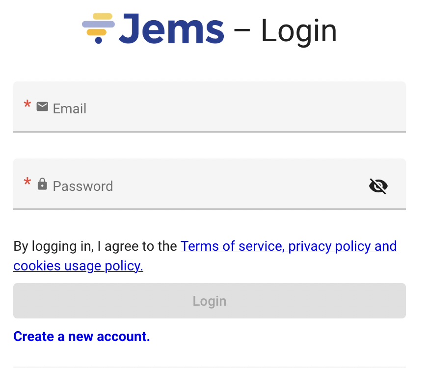 To use Jems, all users must first register by clicking on “Create a new account” link on the welcome screen.