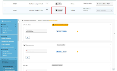 Beneficiaries that are not participating in a project any longer (due to a withdrawal from the partnership) appear with status “Inactive”.