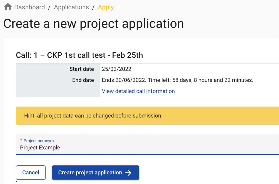 Type the acronym of the project and click on “Create project application” to start a new form.