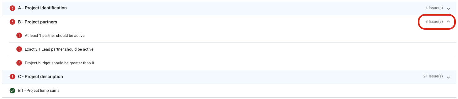 if a RED icon is displayed next to a section, then data need to be added or corrected. Click on the row to expand and read more about the issues found.