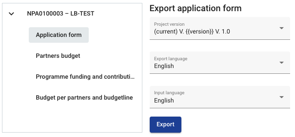 In this section, it is possible to export (download) the project application form in pdf, and project budget tables in Excel format.