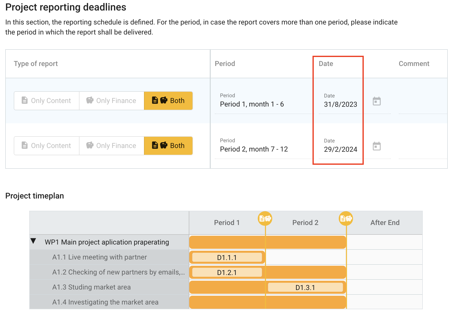The "Date” column of the Reporting schedule displays the deadline by which a Project Report must be submitted to the programme. The report submission deadline is always 3 months from the end of the period.