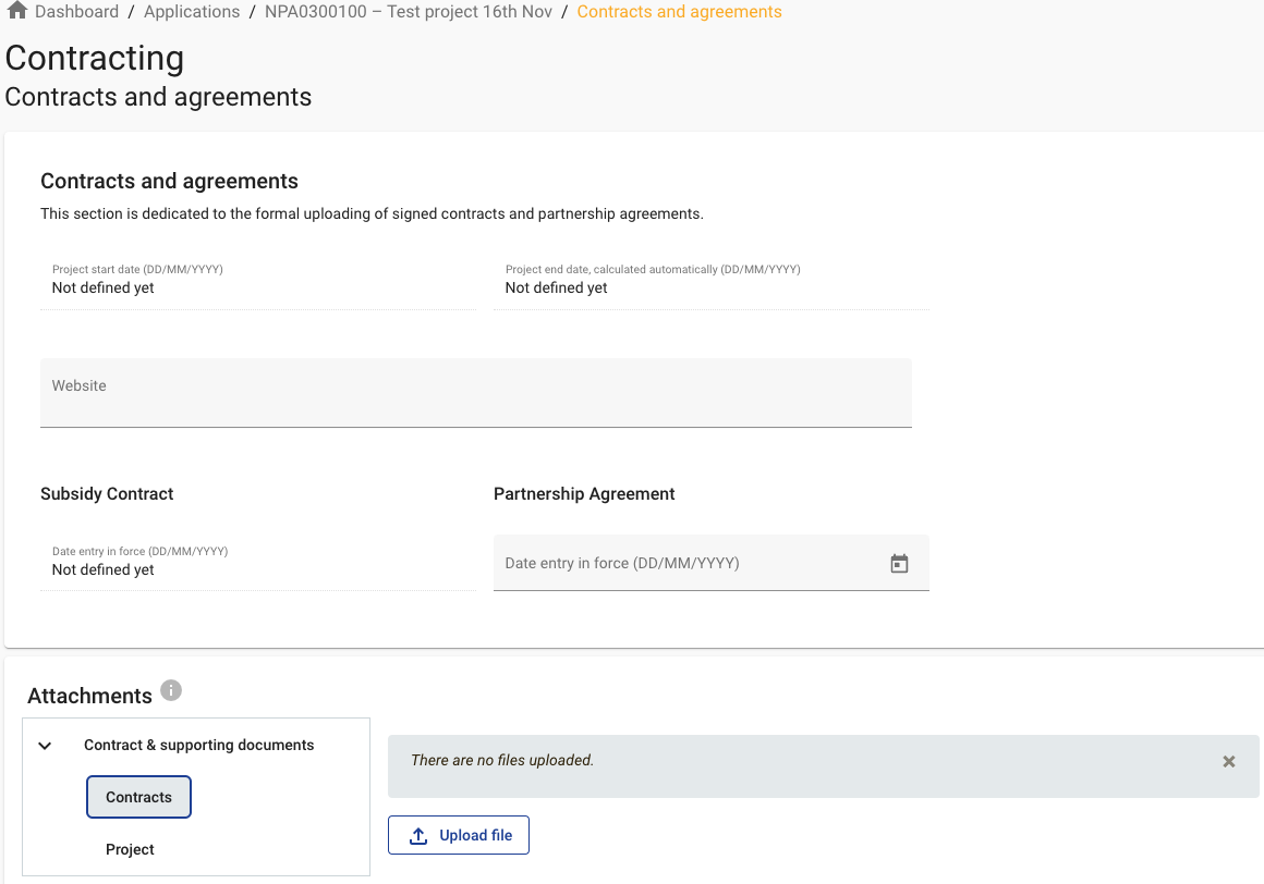 The Contracts and agreements section is where the Lead Partner is expected to upload the Partnership Agreement. It is also where the Grant Letter is uploaded by the Managing Authority.