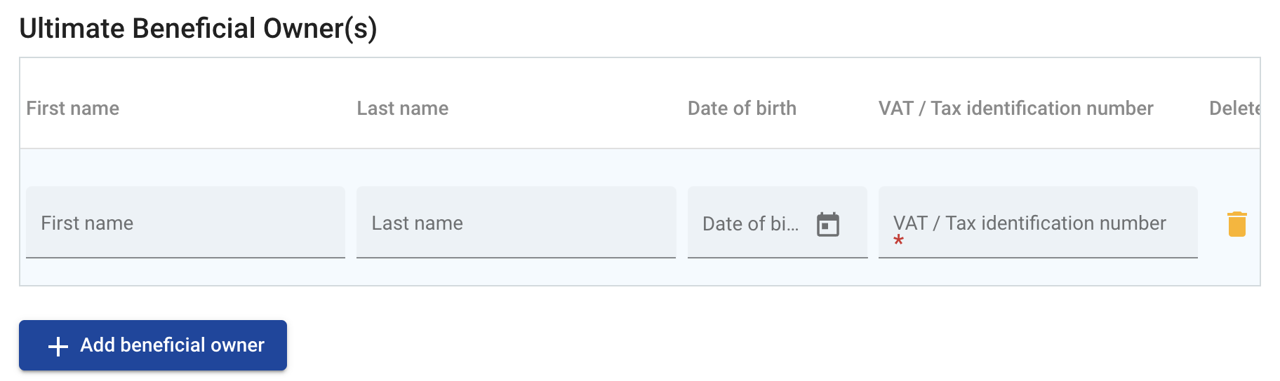 Click on the text fields to enter the VAT/Tax ID number of the UBO. It is sufficient that each partner completes this section with the VAT number of the ultimate beneficial owner(s).