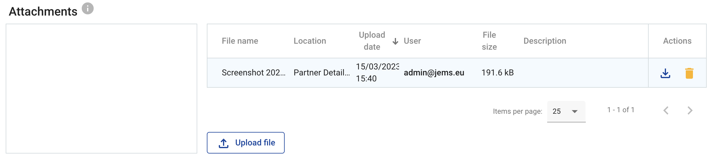 Each partner can upload supporting documentation that is visible to the partner organisation and to other users with access rights to this page, including the programme user.