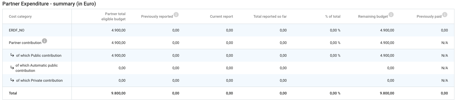 This table shows the partner budget - approved in application form, previously reported and current report - split per cost category.