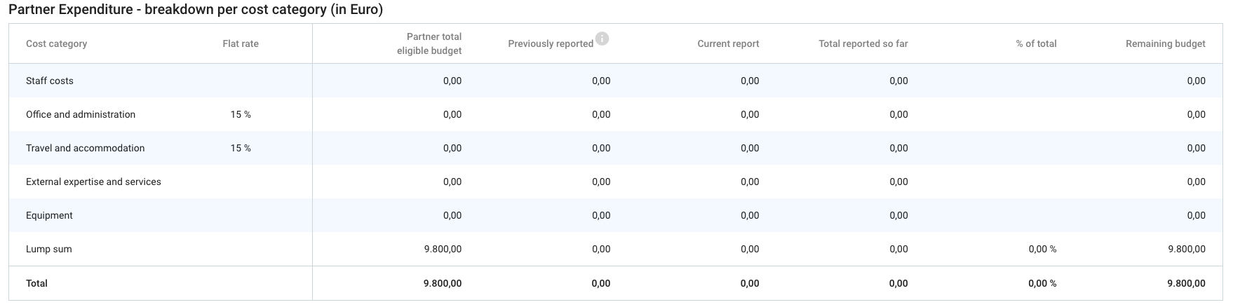 Once the partner report will have been certified, this financial overview will also display the amount that has been verified and approved by the Controller and calculate the remaining budget.