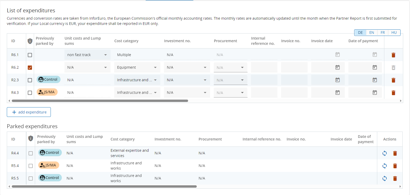 In case a controller/programme user parked some expenditure items in control/verification of project report, they show up in the Parked expenditure section in the List of expenditure.