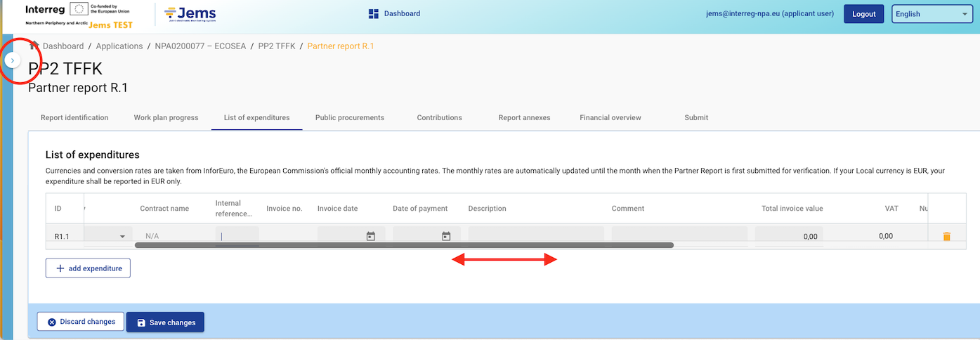 To display as many columns as possible, use the arrow in the top left corner to hide the content menu. Position the mouse in the List of Expenditure table to view the scroll bar and navigate through the tabs.