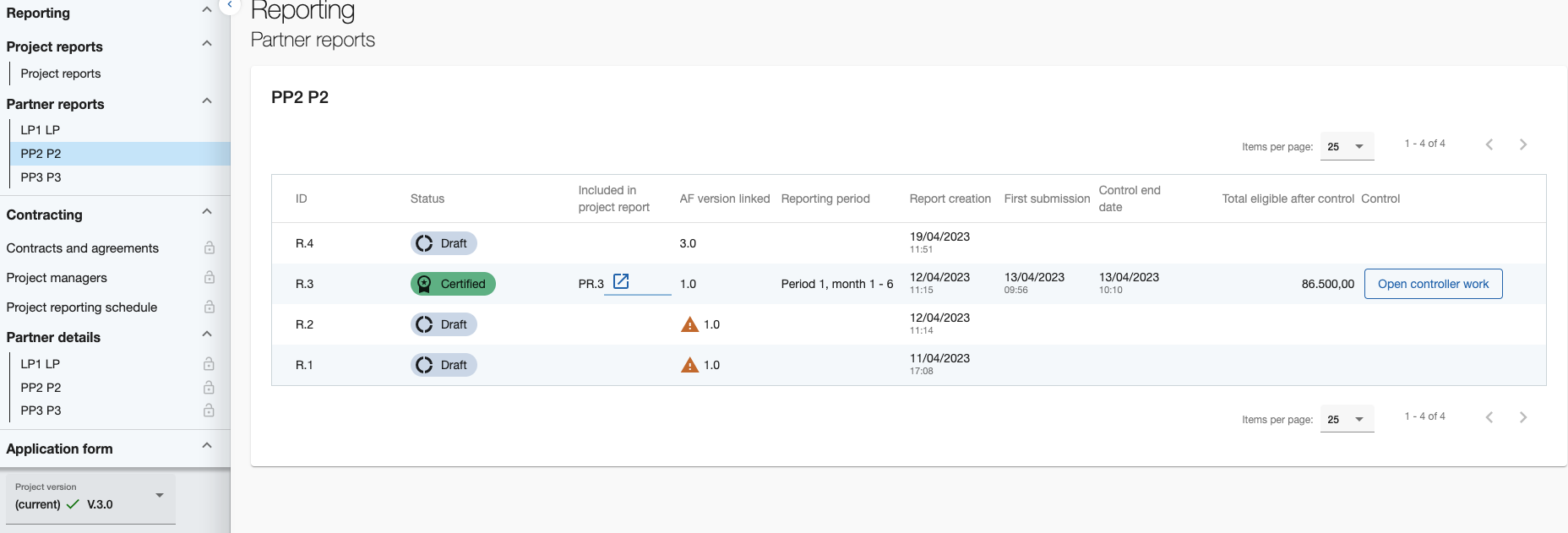Each partner report is based on the data of the currently valid version of the application form (AF). The AF version linked to the partner report is displayed in the overview of the reports.