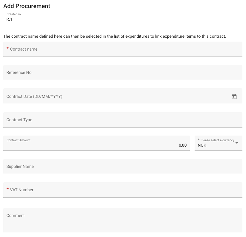 The Contract Name will be used in the List of expenditure. It is therefore important to indicate a distinct name, so that the procurement can be easily identified in the future List of Expenditure.