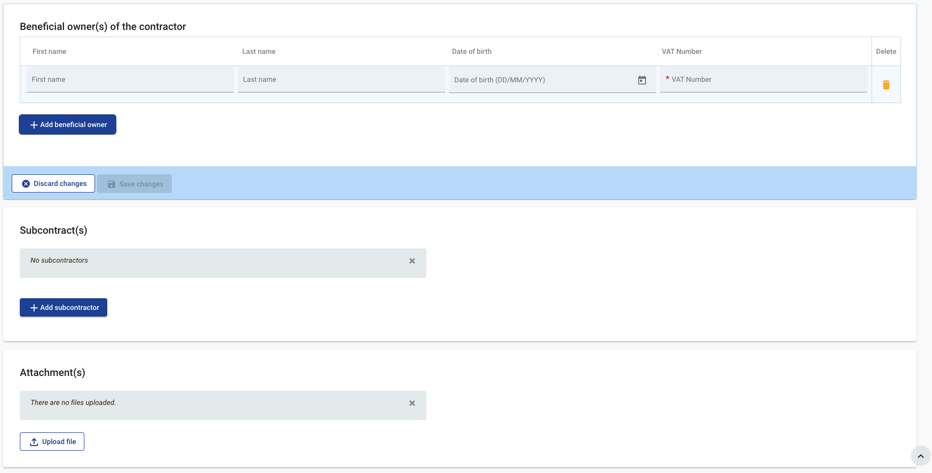 Information on beneficial owners behind the contractors contracted by the partner organisation needs to be available upon request for procurements above the EU-thresholds (Thresholds europa.eu). As a minimum requirement, the VAT number of the contractor should be registered in the procurement section above.