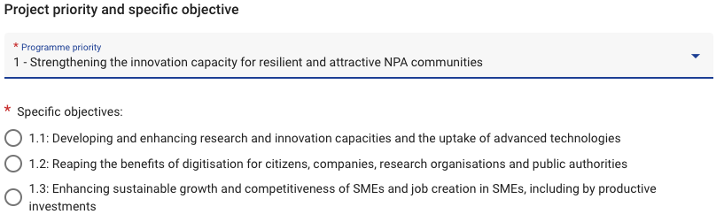 When the Programme Priority is selected from the drop-down menu, then the Specific Objectives will also appear. Tick the one that is the relevant objective for your project.