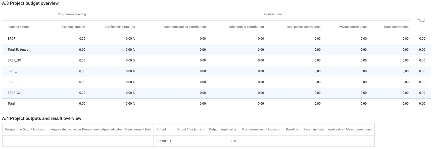 The Preparatory projects budget will be visible in section D. There is no overview table available in section A.3 for this type of projects. In addition, since Preparatory projects are not expected to contribute outputs and results, table A.4 has been deactivated.