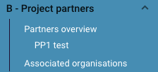 Once a partner organisation has been created, it will appear in a list in the left-hand menu and in “B - Partner Overview” section. To access partner data, select the relevant partner from the list in the Partners overview, or click on the individual partner from the menu on the left-hand side.