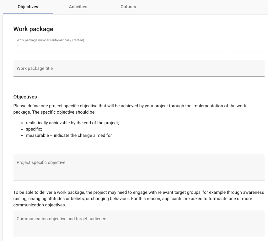 Preparatory projects only have one work package. They do not have project specific objectives and are usually not expected to develop outputs and results.