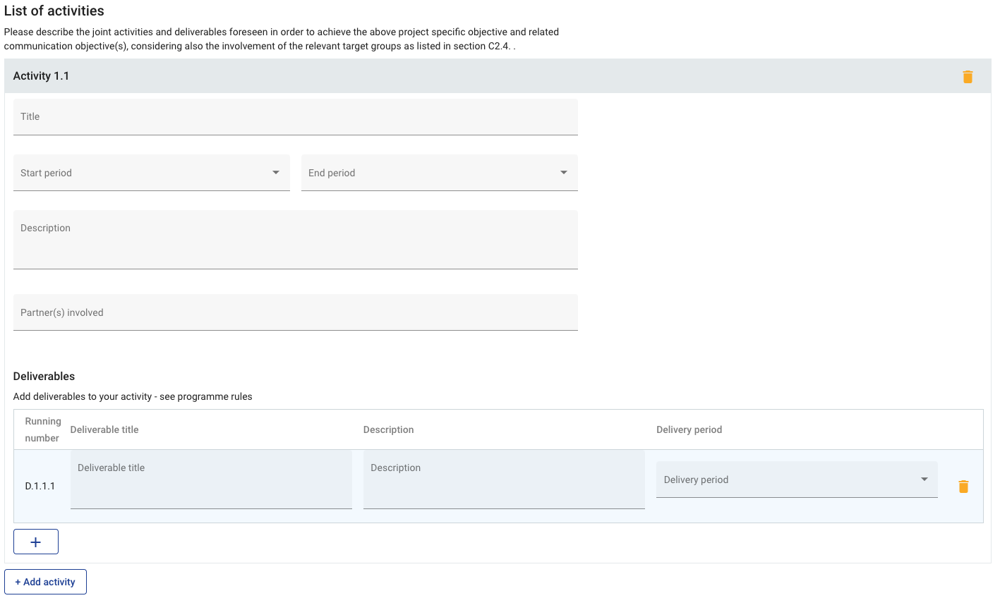 Click on the “+“ icon at the bottom of an activity description, to add a deliverable corresponding to that activity.