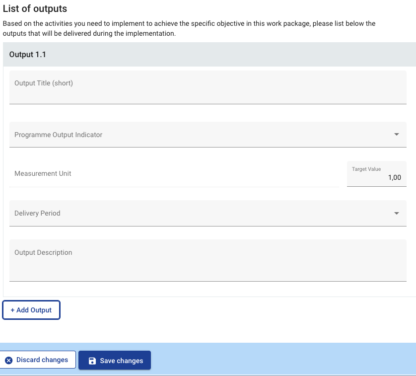 In this section it is required to describe the outputs planned, their connection with the programme output indicators, the target values and delivery periods. All fields are mandatory.