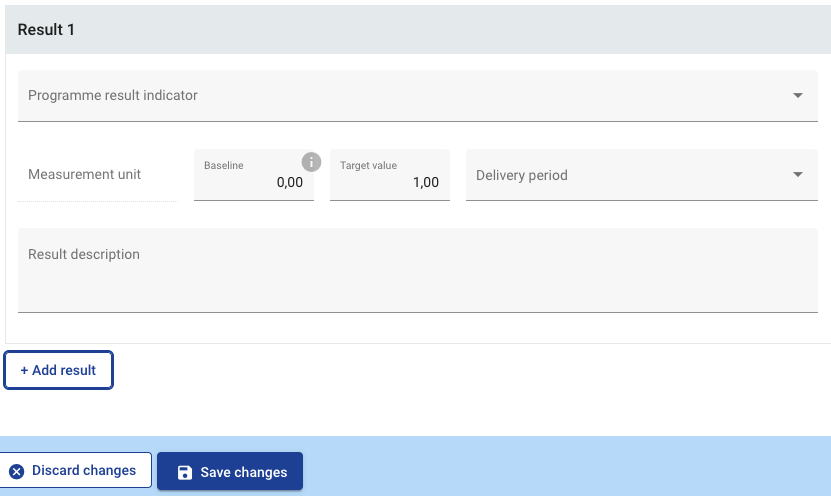 Click “+ Add Result” to create a project result. The programme indicator can be selected from a drop-down list. The measurement unit is defined by the selected indicator.