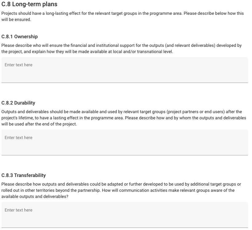 This Section consists of three questions that should be answered by the applicant to explain how the project outputs and results will outlive the project duration.