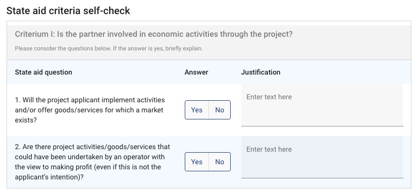 The “State aid criteria self-check” contains four mandatory questions and a justification text field for each question. For further guidance about State Aid, please carefully read the Programme Manual.