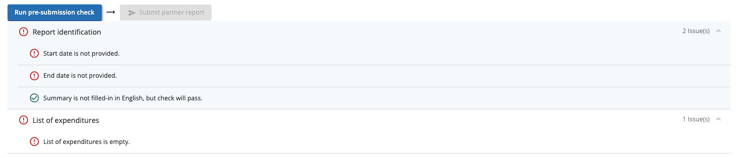 Automated checks are performed on the content of the partner report to ensure that it is completed in all its parts. In case of issues, it is possible to read the cause of the issue and which section of the report needs to be corrected.